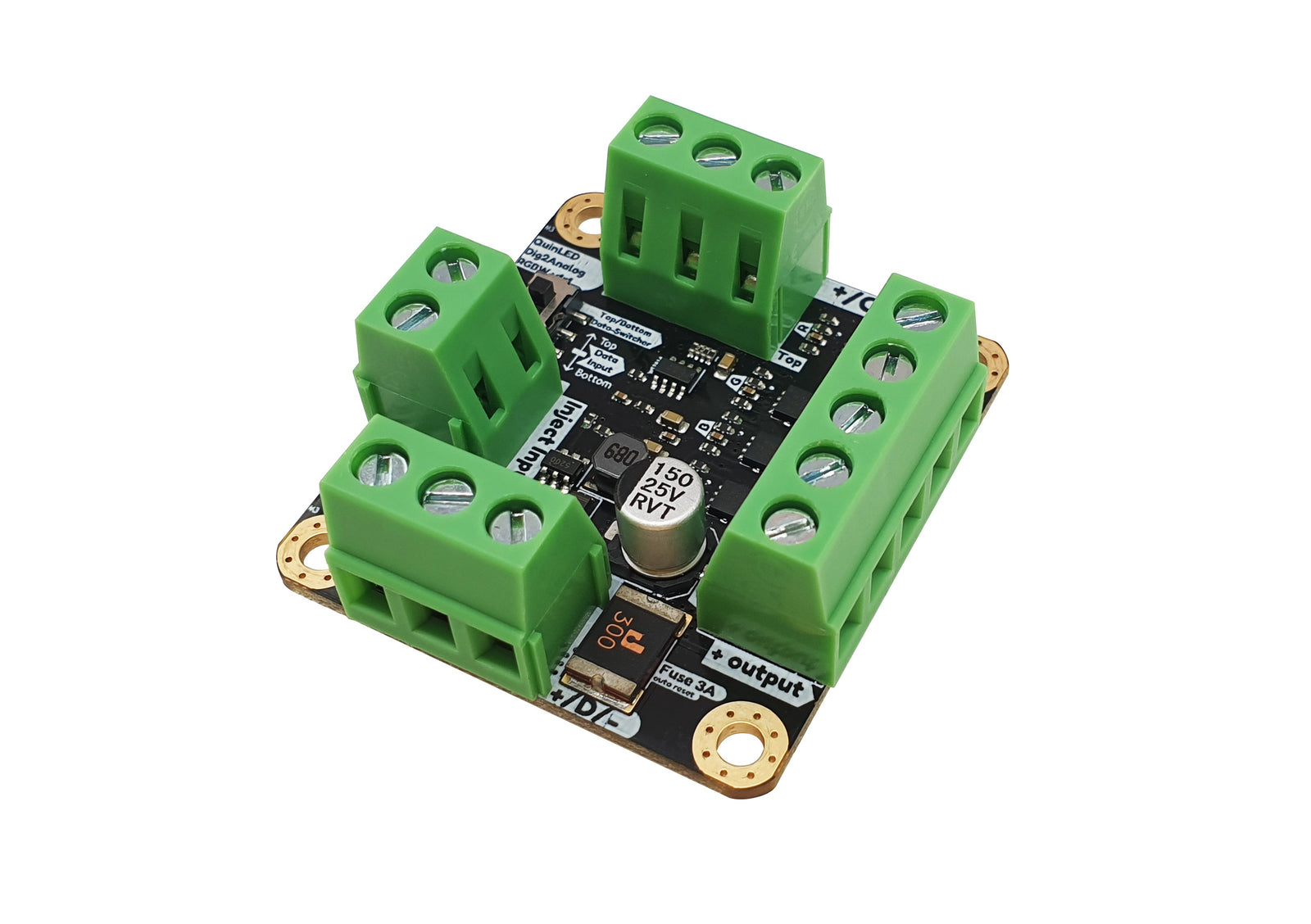 The dig2analog is based on the WorldSemi WS2814F chip. This chip is used to “extract” the data for a single digital LED/Pixel and the board converts it to a PWM output, able to drive Dumb/Analog 12v or 24v LED strips with PWM up to RGBW.